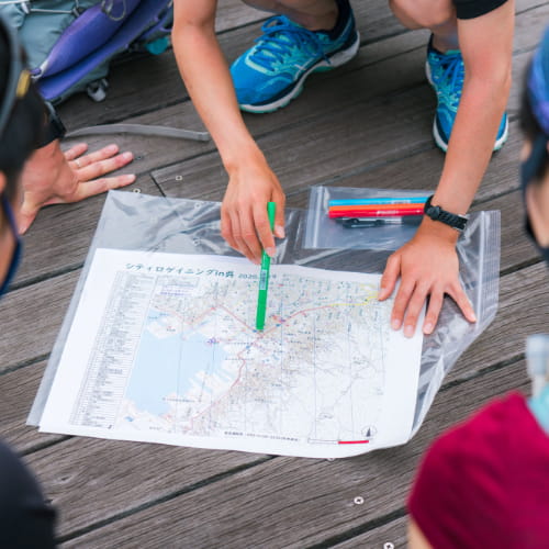 通常のロゲイニングは、参加者(チーム)が山野各所に設置された複数のチェックポイントを、制限時間内にできるだけ高得点になるように回ることを目指す競技です。シティロゲイニングは、フィールドを街に移して、観光などの要素を多く取り入れたイベントなので、初心者やファミリーでも楽しむことができます!